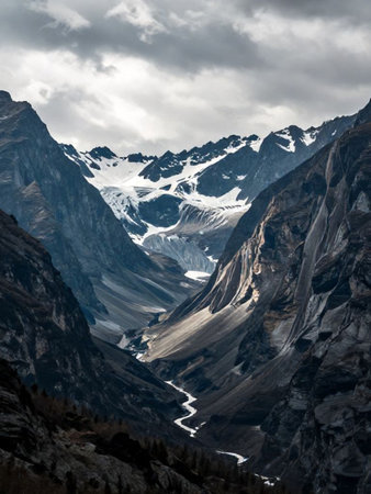 Dramatic view of forested high rocky slopes and snowy mountains in gray cloudy sky in changeable weather, mountain landscape without people