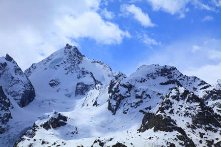 Mountain peaks in sun windy day. Caucasus Mountains, region Dombay.