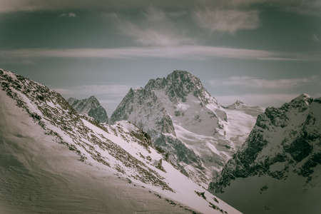 Gloomy mountain top landscape with thunder cloudy sky, rocky ranges and peaks with glaciers and snow fields. Rainy day in wild nature. Belalakaya, Dombay, Caucasus