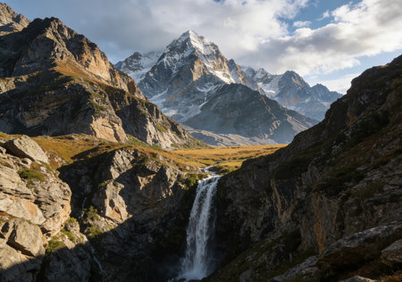 Colorful alpine landscape with great mountain in autumn colors with snow on peak in sunshine under cirrus clouds in blue sky. Picturesque autumn scenery with sunlit rocks and snow-covered mountain top