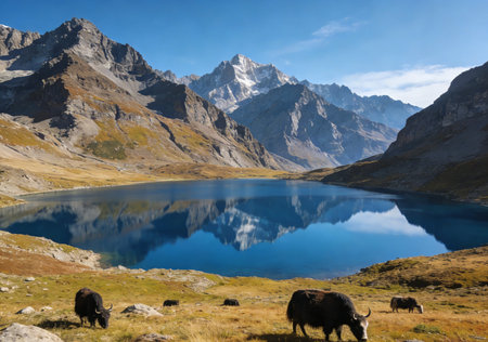 Yak and mountain lake in Cordillera Huayhuash, Peru
