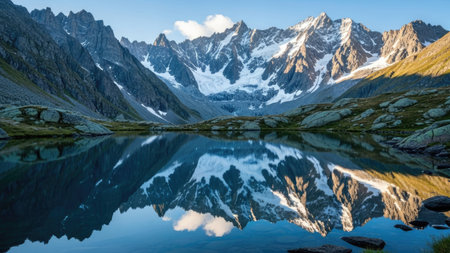 A tranquil mountain lake showcases stunning reflections of the surrounding peaks and a clear blue sky. Smooth stones line the water's edge, enhancing the natural beauty and serenity of this peaceful outdoor scene, perfect for nature lovers and adventurers.