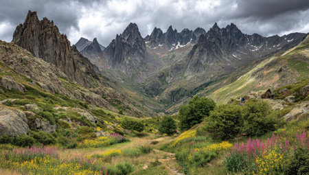 A serene alpine valley at sunrise a winding stream reflecting jagged, snow-capped mountains amidst a wildflower-fille...