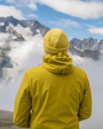 Back portrait, a man in a knitted yellow hat and a yellow jacket sits looks at the snow-capped mountains
