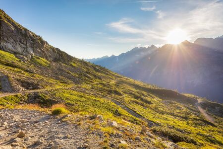 The bright sun hides behind the top of the mountain. The view from the hill. Cloudless sky and natural space. The concept of business thinking, a good idea or message. mountain pass