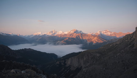 Serene sunrise over snowcapped mountain range with low valley fog and warm light