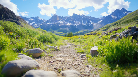 A breathtaking view of a winding path leading through lush greenery, surrounded by majestic mountains under a vibrant blue sky, perfect for outdoor adventures.
