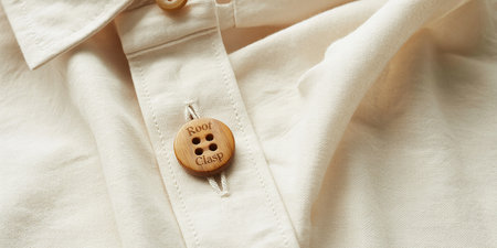 A wooden button with Root Clasp engraved is attached to a cream colored shirt Clear details and vibrant colors...