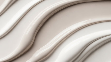 Abstract macro view of smooth, flowing cosmetic cream swatches in soft beige and white tones, creating a gentle, wavy pattern.