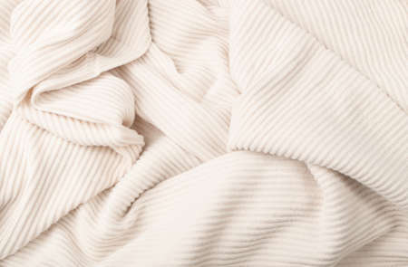 Natural Beige Texture Background. Striped Folded Cotton Fabric Pattern, White Textile Wallpaper, Soft and Comfortable Natural Material Mockup with Copy Space