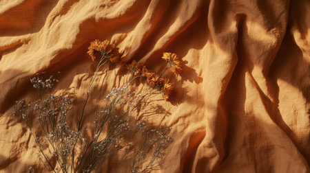 A captivating arrangement of dried flowers on a soft orange fabric background, highlighting natural textures and warmth, perfect for artistic and decorative themes.