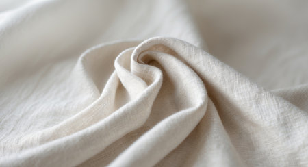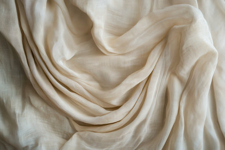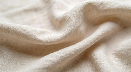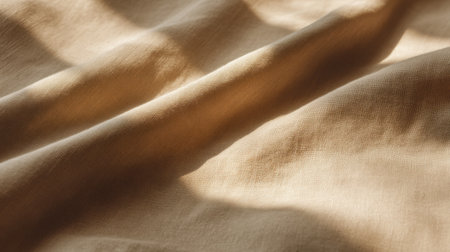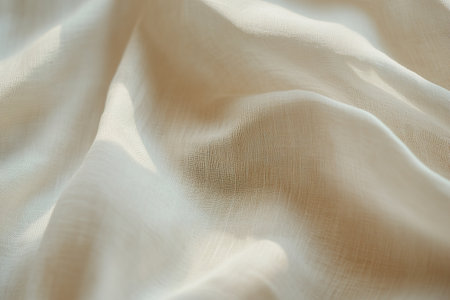 A captivating close-up of soft textured fabric drapery in natural beige tones. The gentle creases and folds create an elegant and cozy atmosphere, perfect for artistic projects and interior design.