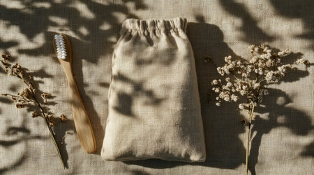 Top view of a bamboo toothbrush and a small linen bag with leaf shadows and dried flowers on beige fabric. Eco-conscious lifestyle