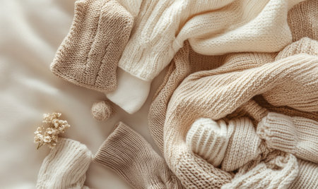 Soft knitted clothes in warm colors, laid out on a pastel background