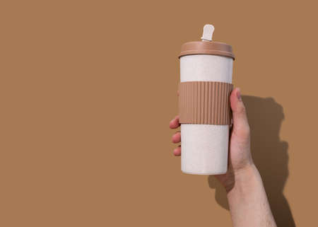 Refillable cup in young mans hand on beige background. Concept of plastic-free and zero waste living