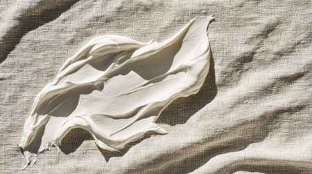 Thick smear of white cream with swirled patterns on a linen fabric background, giving a textured and artistic appearance. The cream appears shiny --chaos