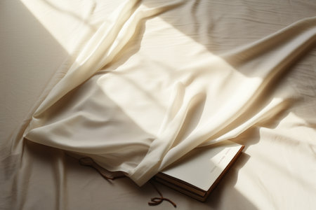 A close-up view of soft fabric gently illuminated by sunlight, creating an elegant and warm atmosphere. The texture and folds create a tranquil scene.