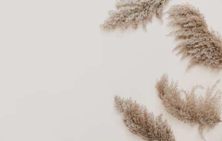 Pampas branch flowers on beige background. Beautiful pattern with neutral colors. Minimal, stylish concept. Flat lay, top view, copy space