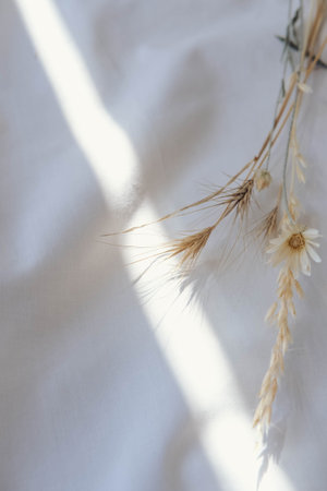 Dry flower on white fabric background with sunlight and shadow from window.
