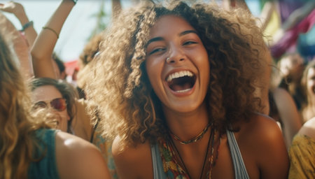A cheerful young woman with long, flowing hair raises her arm in excitement at a lively outdoor festival. Her radiant smile and carefree spirit capture the essence of joy and freedom, surrounded by a colorful crowd enjoying the festivities