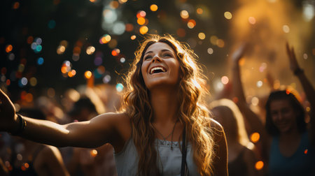 Beautiful young woman having fun at colourful music festival. Happy girl enjoying herself and dancing. Summer holiday, vacation concept. Generative AI.