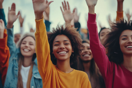 A diverse group of joyful young individuals raises their hands in excitement during an outdoor gathering, enjoying moments of connection and celebration in a vibrant atmosphere.