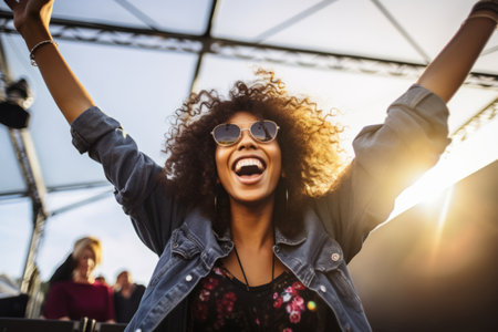 Cheerful young woman with Afro hairstyle and sunglasses dancing at music festival