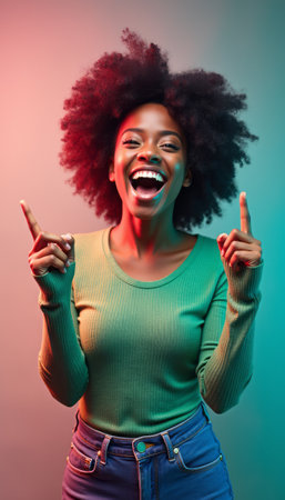 A cheerful young Black woman with a voluminous afro hairstyle beams with excitement, pointing upwards against a backdrop of soft pink and green hues. Her infectious smile radiates positivity and energy, capturing a moment of pure joy and celebration.