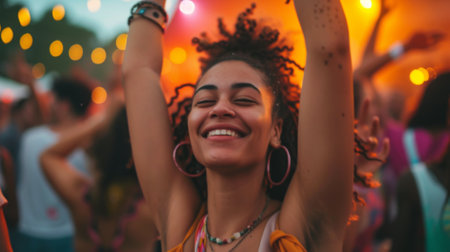 A joyful young woman with a bright smile raises her arms in celebration at a lively event, surrounded by a colorful atmosphere filled with excitement and energy.
