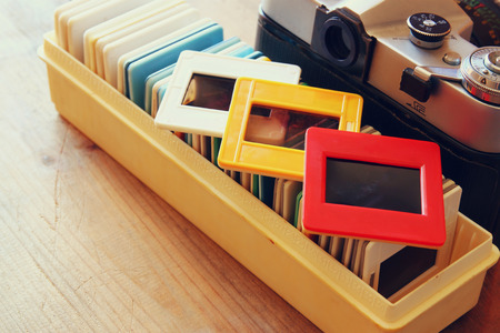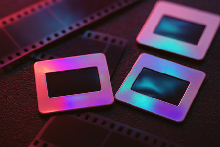 Vintage film slides illuminated by colorful neon light on dark textured background, symbolizing retro nostalgia.