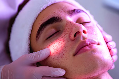 Young man receiving acne treatment in a dermatology clinic, with gloved hands gently touching his face and a calming pink light used for skin therapy, highlighting skincare and wellness. High quality photo