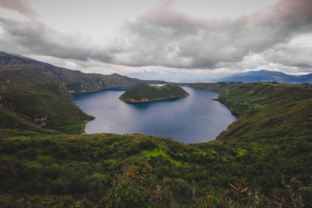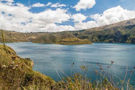 Looking towards the island on famous Lake Cuicocha in Ecuador. Panorama over a blue lake, surrounded with lush greens and white clouds.