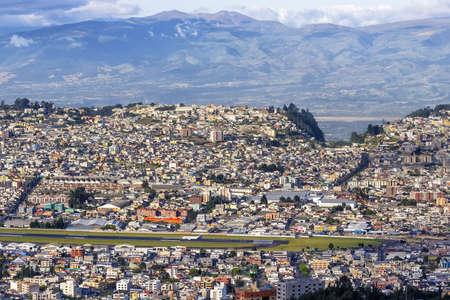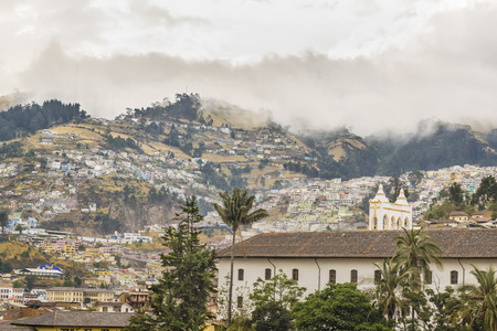 Cityscape aerial view of historic center of Quito city from the top of San Juan Basilica church.