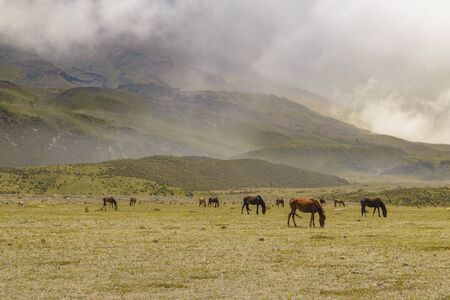 Andean landscape scene with horses eating at Cotopaxi national park, Ecuador
