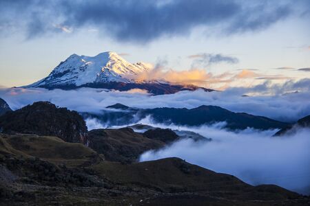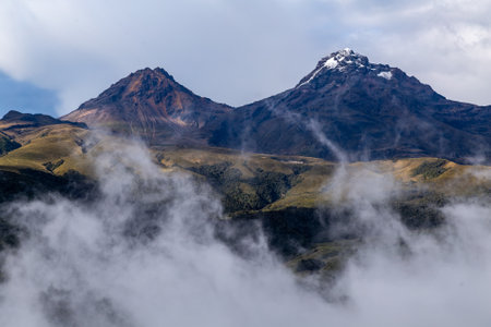 Beautiful view of the snow caped Illinizas volcano, in the Ecuadorian Andes, on a sunny and overcast morning.