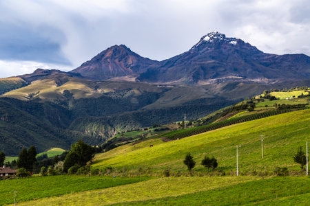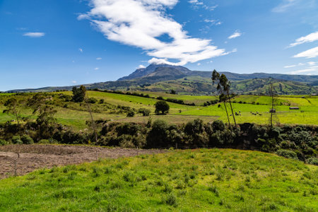 Ilinizas Volcano, Andean landscape with its crop fields and mountains showing their greenery on a clear morning, south eastern view.