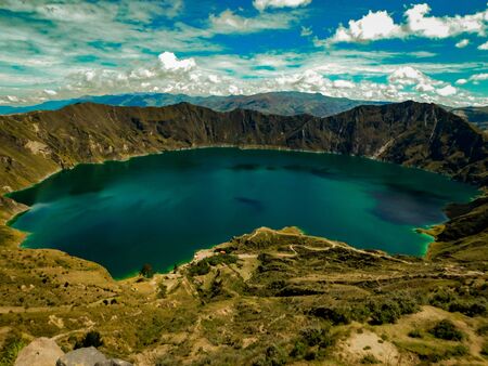 panoramic scenery overlooking at Quilotoa lake at the crater rim in Quilotoa, Ecuador