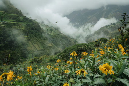 A lush green mountain landscape shrouded in mist, dotted with vibrant yellow wildflowers in the foreground under a cloudy sky. Generative AI