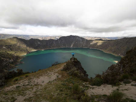 Young male hiker in blue jacket at andean volcano caldera crater lake Quilotoa rim ridge loop in Pujili Cotopaxi Ecuador andes South America