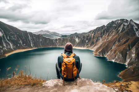 Viewpoint with man sit in front of Lagoon Cuicocha, Ecuador
