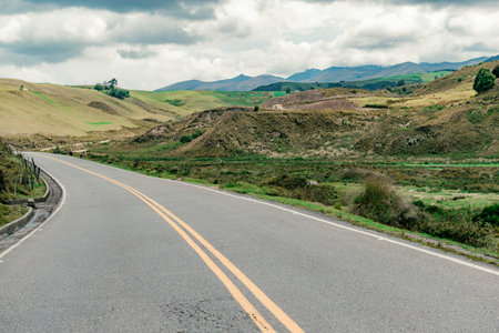 mountainous landscape with a road that disappears into the horizon in a cold climate and green pastures on the side