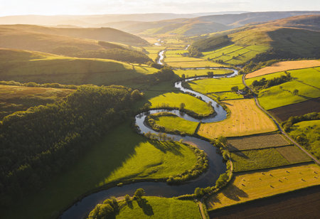 Aerial view of the river flowing through the valley at sunrise.