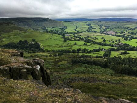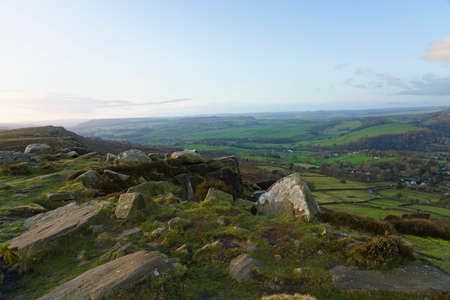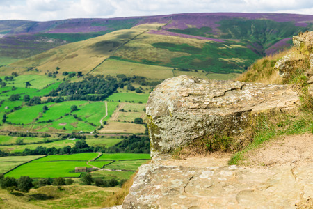 Peak District National Park, Derbyshire, England. Stacked rock formations in Stanage edge, with the fields and pastures on the background, selective focus