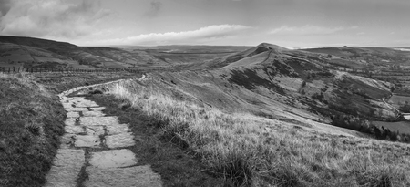 Black and white landscape of Mam Tor in Peak District during autumn.