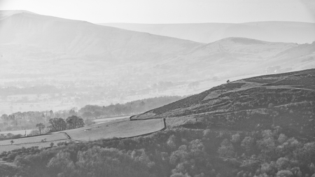 Beautiful landscape image of the Peak District in England on a hazy Winter day viewed from the lower slopes of Bamford Edge in black and white