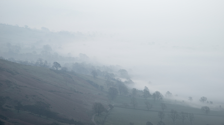 Peak District, Derbyshire, morning mist in Hope valley and Edale, seen from Mam Tor