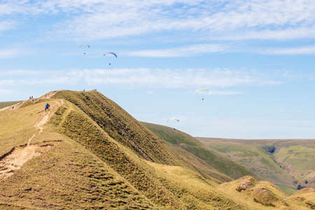 Paragliding in Peak district, an upland area in England at the southern end of the Pennines, UK
