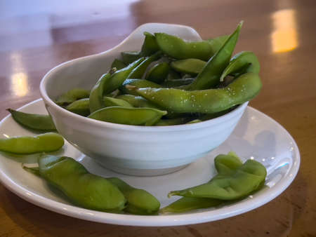 Close up, selective focus on edamame pods in a small white cup on a wooden table inside a restaurant