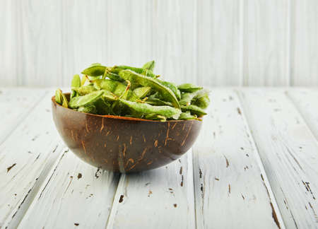 Green soy beans on basket, Fresh beans on wooden background