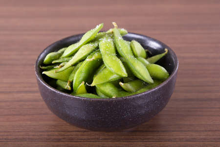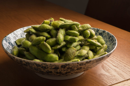 Japanese green soy bean on the wooden table.